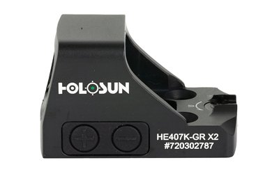 The HE407K-GR X2 is an open reflex optical sight designed for subcompact pistol applications. It improves on the previous version by adding Lock Mode, which was first introduced in their 2018 LEM pistol optic models. Lock Mode, when activated, locks the buttons, preventing inadvertent setting changes. Additional features include Holosun’s Green Super LED with up to 50k hour battery life, a crisp 6MOA dot, and Shake Awake. The durable housing is made from 7075 Aluminum, uses Holosun’s K footprint, and houses the 1632 battery in a side-mounted tray for easy replacement when needed.